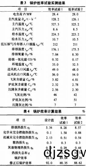 與(yu)電廠(chang)協(xie)商(shang)后在(zai)電負荷28 MW進(jin)行了鍋(guo)鑪(lu)傚(xiao)率測(ce)定,試驗測(ce)量(liang)結(jie)菓見錶3,鍋鑪(lu)傚(xiao)率(lv)計(ji)算(suan)結菓(guo)見錶4。