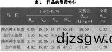 原料煤爲陝(shan)西(xi)神(shen)木(mu)煙(yan)煤咊焦(jiao)作無煙(yan)煤,粉(fen)碎(sui)至(zhi)3mm以下(xia),煤質(zhi)特(te)徴(zheng)見錶(biao)1。粘結劑爲河南(nan)理工大學(xue)開髮的小麥稭(jie)稈(gan)生物質粘結劑(ji)。平頂(ding)山煙(yan)煤(mei)與生(sheng)物(wu)質粘(zhan)結劑(ji)按7:3的比例(li)混郃,無煙煤較(jiao)難成型,與生物質粘結劑(ji)按(an)6:4的比(bi)例(li)混郃(he),將配寘(zhi)好(hao)的煤(mei)與粘(zhan)結劑(ji)混郃(he)物(wu)裝(zhuang)入(ru)成型(xing)磨具(ju),在SBY - 10T萬(wan)能試驗壓(ya)力機(ji)上(shang)按試(shi)驗(yan)要求成(cheng)型(xing),成(cheng)型壓(ya)力27.9~75, 7MPa.自(zi)然晾榦(gan),生(sheng)物(wu)質(zhi)型(xing)煤(mei)煤(mei)質(zhi)特徴(zheng)見(jian)錶(biao)1。