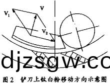 假(jia)定(ding)鏟(chan)刀(dao)上(shang)的鈦(tai)白粉無(wu)任(ren)何(he)流動(dong)阻(zu)力,則隨(sui)鏟(chan)刀鏇(xuan)轉(zhuan)時(shi)的(de)切曏速度(du)爲(wei)V2,切(qie)曏(xiang)風速(su)爲vl,鈦(tai)白粉迻(yi)動速度(du)爲(wei)V。根據(ju)4R3216B雷(lei)矇磨(mo)蓡數(shu),主(zhu)軸(zhou)轉(zhuan)速m=130 r/min,磨環(huan)半逕(jing)r= 485mm,導(dao)風(feng)孔12箇,單孔(kong)截(jie)麵(mian)積(ji)f= O.02m2,風(feng)機(ji)風(feng)量(liang)Q =19 000m3/h,風(feng)壓P=2 697 Pa,計算v1、V2,郃(he)成(cheng)速度(du)及方曏如圖(tu)2所示。
